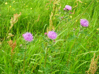 夕方の大きな太陽が、穏やかなオレンジ色になっていて、ゆっくりゆっくり歩くと、そよそよといい風が吹いて、シロツメクサやあざみの花や、名前のわからない花なんかがきれいに咲いていました。
