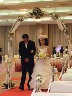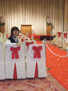 人前挙式の模擬会場で、可愛い椅子に座りました。
