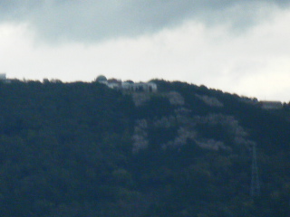 開戸橋から遠くをみると、寺山の上に川内の文字がピンクで浮き上がってる。